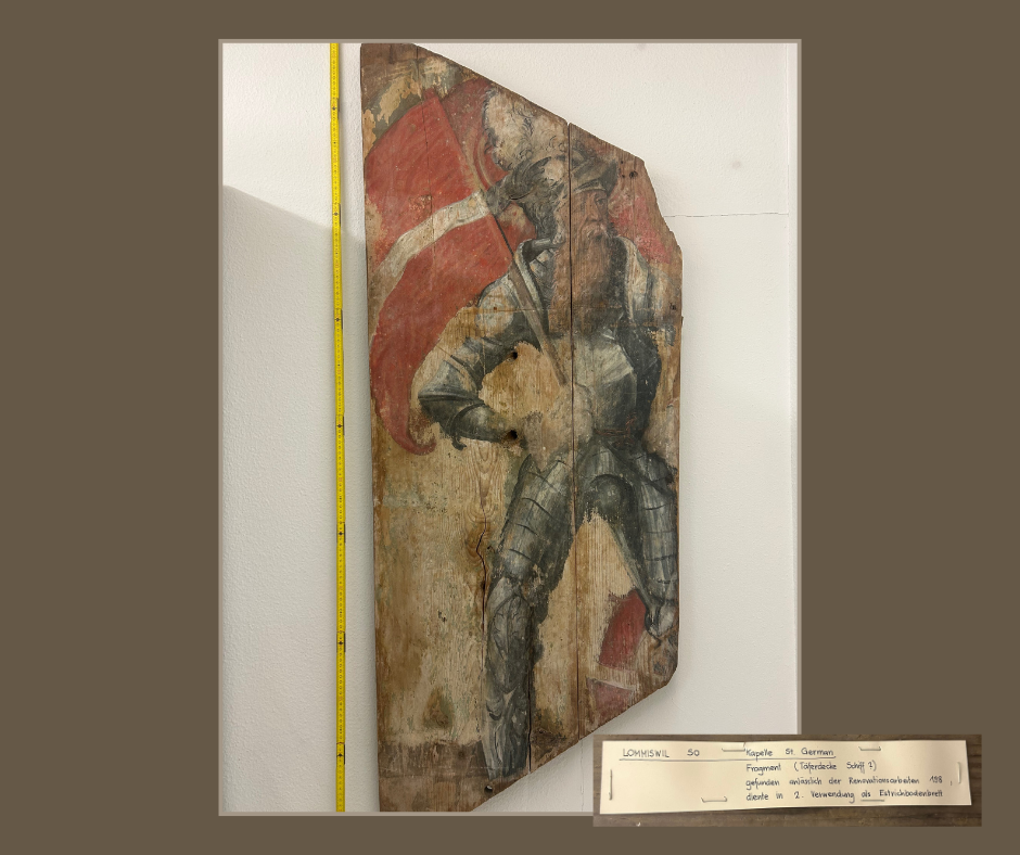 Im Februar 2025 war es dann soweit und ich durfte den Soldaten aus der Kapelle mit eigenen Augen bestaunen: Die Holzplatte misst rund 1.70 Meter und ist in erstaunlich gutem Zustand. Der gemalte Soldat ist klar zu erkennen, die Farben sind kräftiger, als man es von den alten Fotos hätte vermuten können. Laut der wissenschaftlichen Mitarbeiterin Regula Graf könnte es sich dabei nur um die Hälfte einer ursprünglichen Darstellung handeln.
